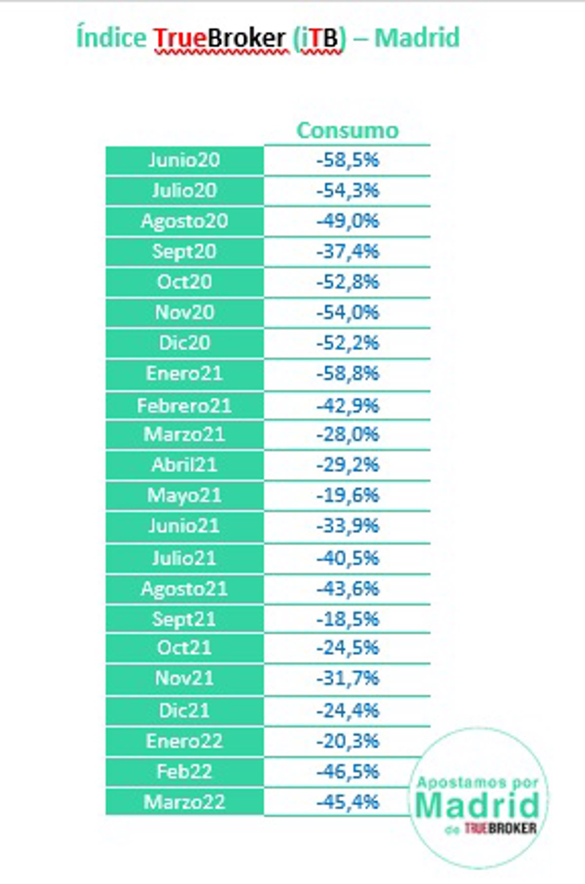 La guerra mantiene por segundo mes consecutivo el consumo en Madrid un 46% por debajo que antes del Covid - ÍNDICE TRUEBROKER (ITB)