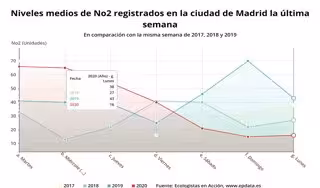 A la vista de esta situación, Ecologistas en Acción está realizando un seguimiento exhaustivo del comportamiento de la polución en Madrid estas semanas, ya que de momento son pocos los días para sacar conclusiones tajantes sobre el confinamiento. Así, explican que a pesar de que desde el miércoles no hubo actividad académica y bajó algo el tráfico, no hubo una reducción de la contaminación por la situación meteorológica, dominada por un anticiclón con altas temperaturas, no que no empeora los registros contaminantes.