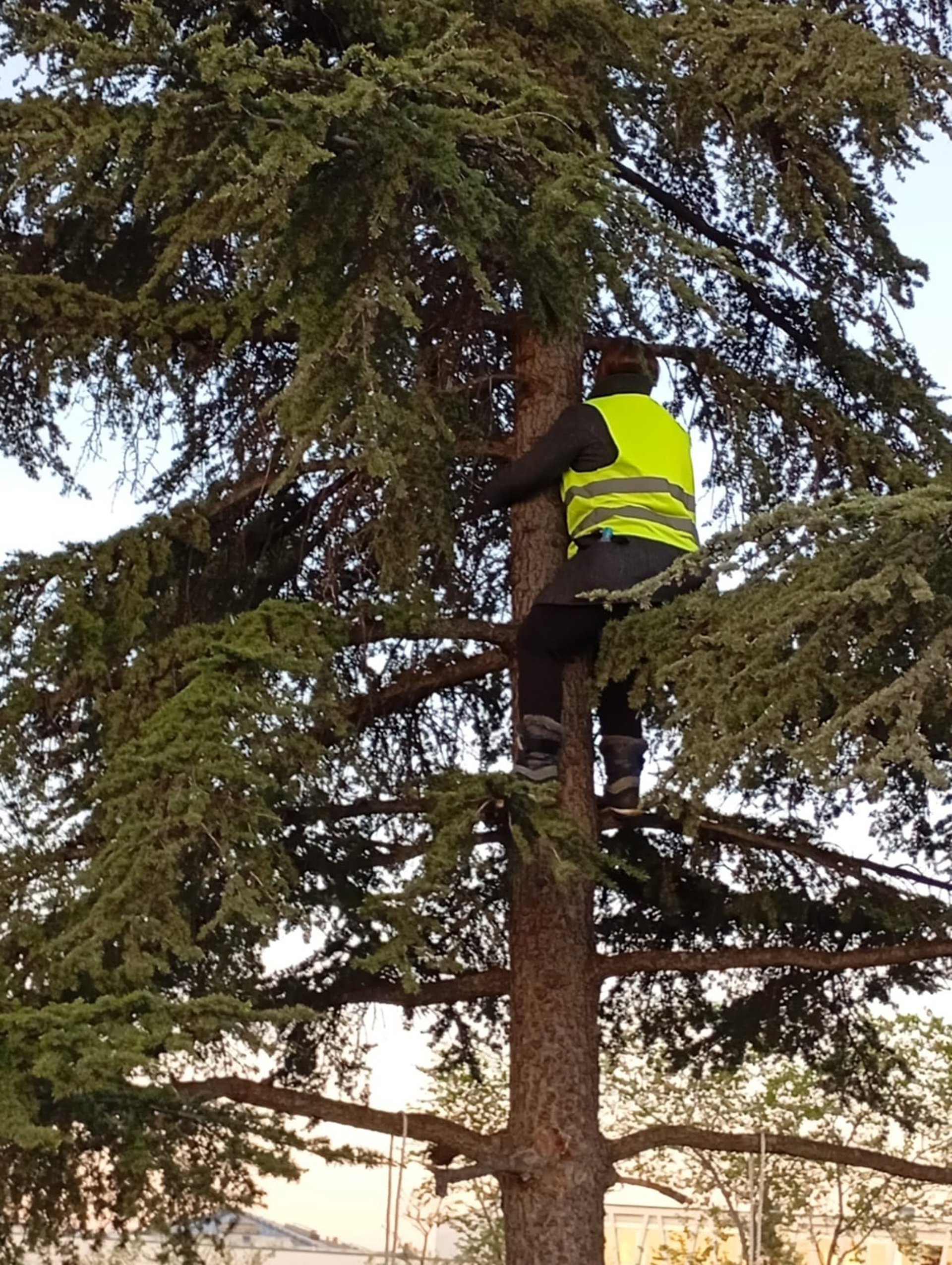 Una vecina se sube a un árbol donde se están realizando los trabajos previos de cara a la ejecución del cantón de limpieza en el barrio de Montecarmelo. - AV MONTECARMELO