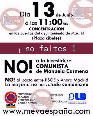 "Todos a manifestar nuestra disconformidad con el pacto entre Ahora Madrid y el PSOE el día la investidura. La mayoría votó a opciones no comunistas", han señalado MEVA, que añade en los carteles el lema 'No a la investidura comunista de Manuela Carmena' y los logos de Podemos y el PSOE tachados.