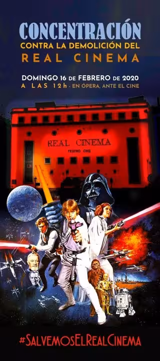 La asociación Madrid Ciudadanía y Patrimonio convoca este domingo una concentración contra el derribo del Real Cinema de Ópera con un guiño al cine, en concreto a las películas de 'La guerra de las galaxias'.