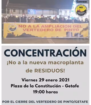 La concentración tendrá lugar a las 19 horas bajo el lema 'No a la nueva macroplanta de residuos. Por el cierre del vertedero de Pinto/Getafe y una verdadera alternativa de gestión de residuos'.