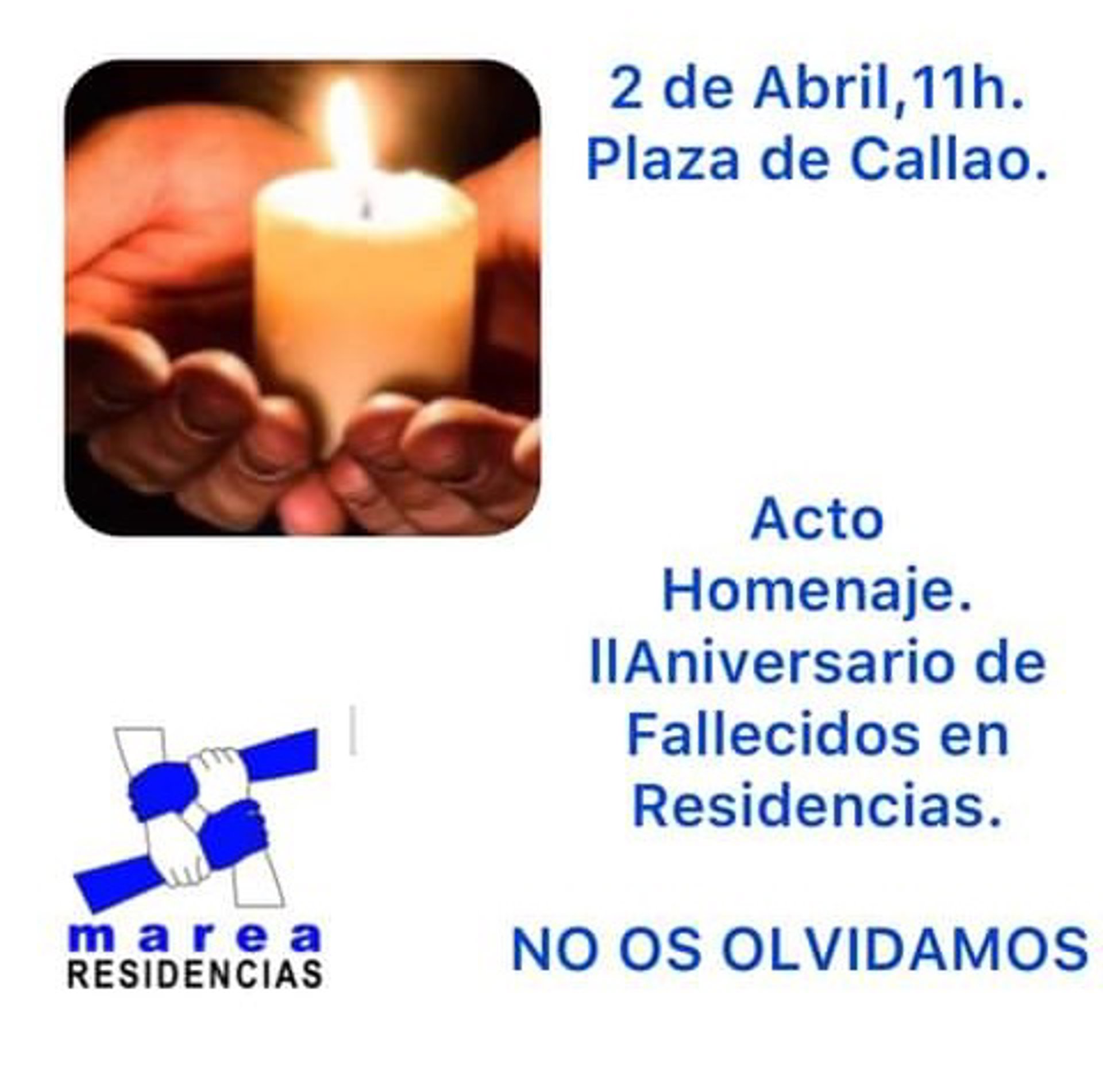 Marea de Residencias ha convocado una concentración para este sábado, 2 de abril, a las 11 horas en la plaza de Callao de Madrid, en homenaje a los ancianos fallecidos en residencias hace dos años al inicio de la pandemia de coronavirus.