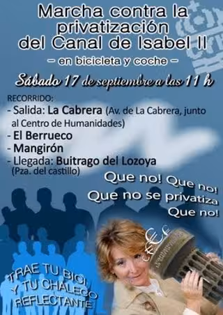 Diversas asociaciones han convocado para hoy sábado una marcha en bicicleta y en coche por la Sierra Norte de Madrid contra la privatización del Canal de Isabel II, ha informado la plataforma que reúne a dichas organizaciones.