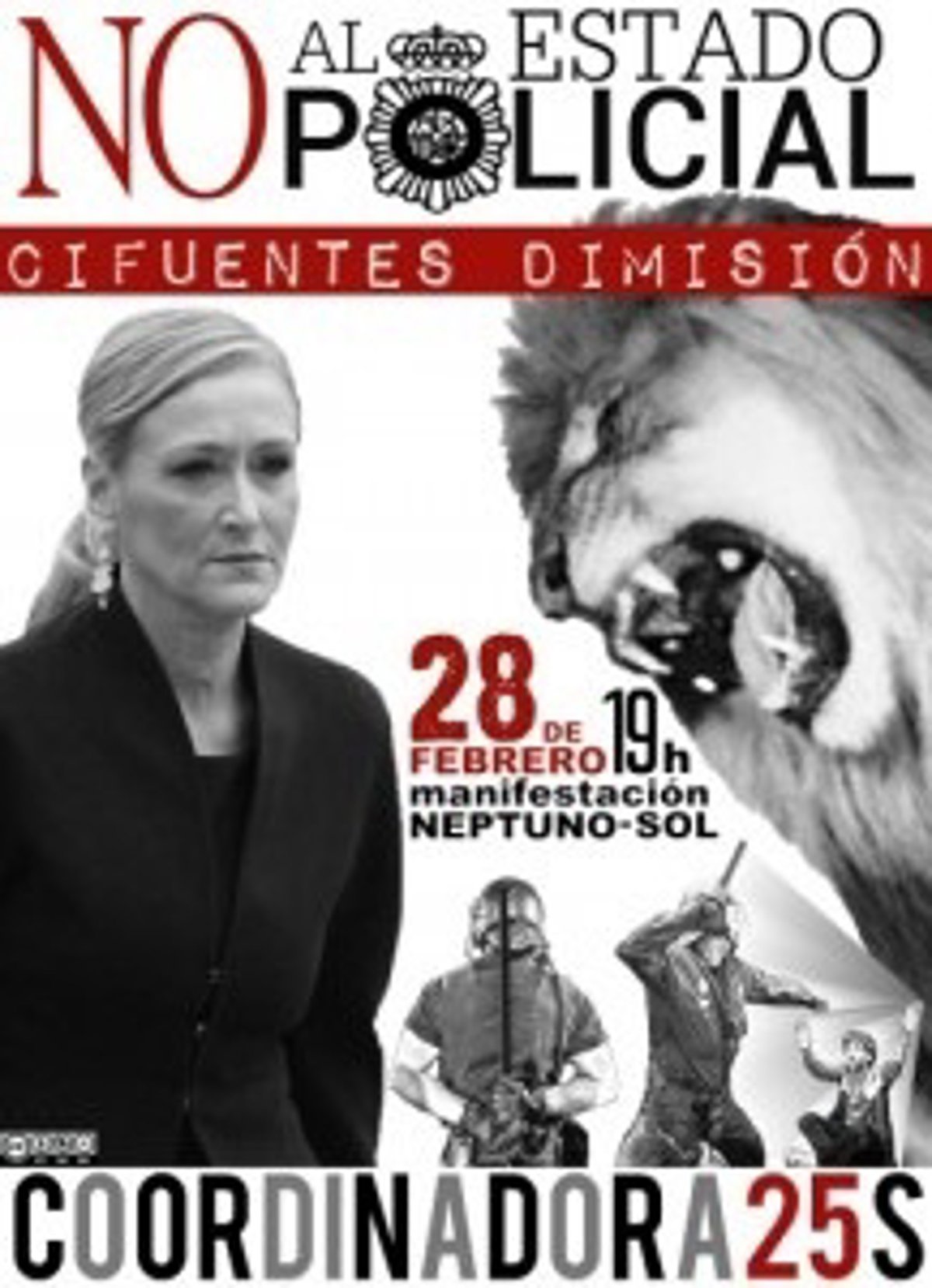 La Coordinadora 25S celebración una manifestación hoy sábado a las 19 horas de Neptuno a Sol bajo el lema 'No al estado policial. Cifuentes dimisión', que ha sido autorizada por la Delegación.