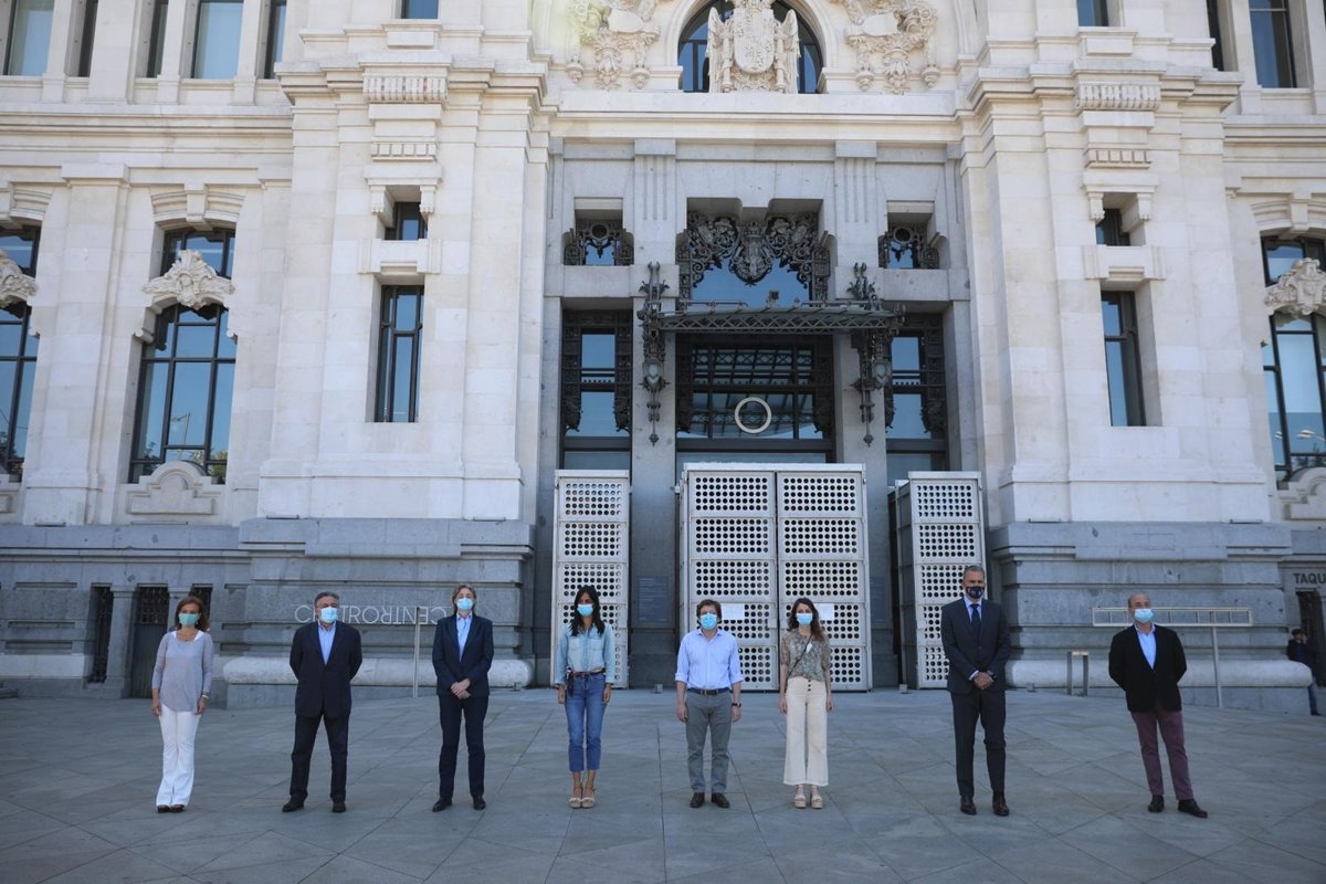 Los cinco grupos municipales con representación en el Ayuntamiento de Madrid (PP, Cs, Más Madrid, PSOE y Vox) han guardado este viernes un minuto de silencio a las 12 horas frente al Palacio de Cibeles en recuerdo de las víctimas de la Covid-19.