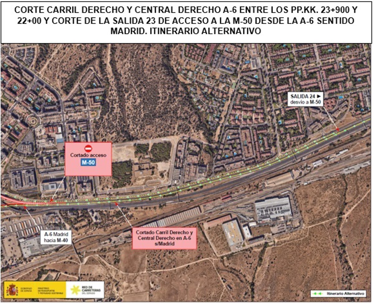 En concreto, se cortarán los carriles derecho y central derecho de la calzada sentido Madrid de la A-6, entre los kilómetros 23,900 y 22, y se cerrará totalmente la salida 23 de acceso a la M-50.
