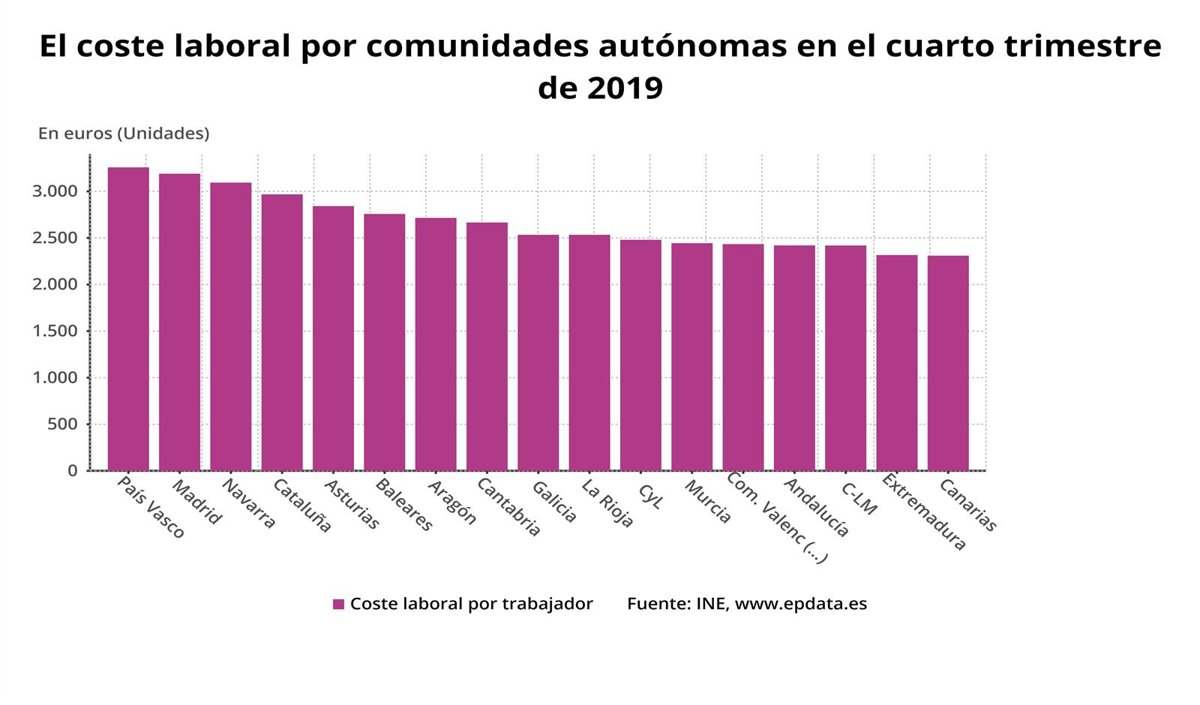 Por comunidades autónomas, los costes laborales más altos los registraron País Vasco (3.257,9 euros por trabajador y mes), Madrid (3.189,4 euros), Navarra (3.093,7 euros), Cataluña (2.967,9 euros) y Asturias (2.841,6 euros), mientras que los más bajos se dieron en Canarias (2.309,6 euros) y Extremadura (2.316,2 euros).