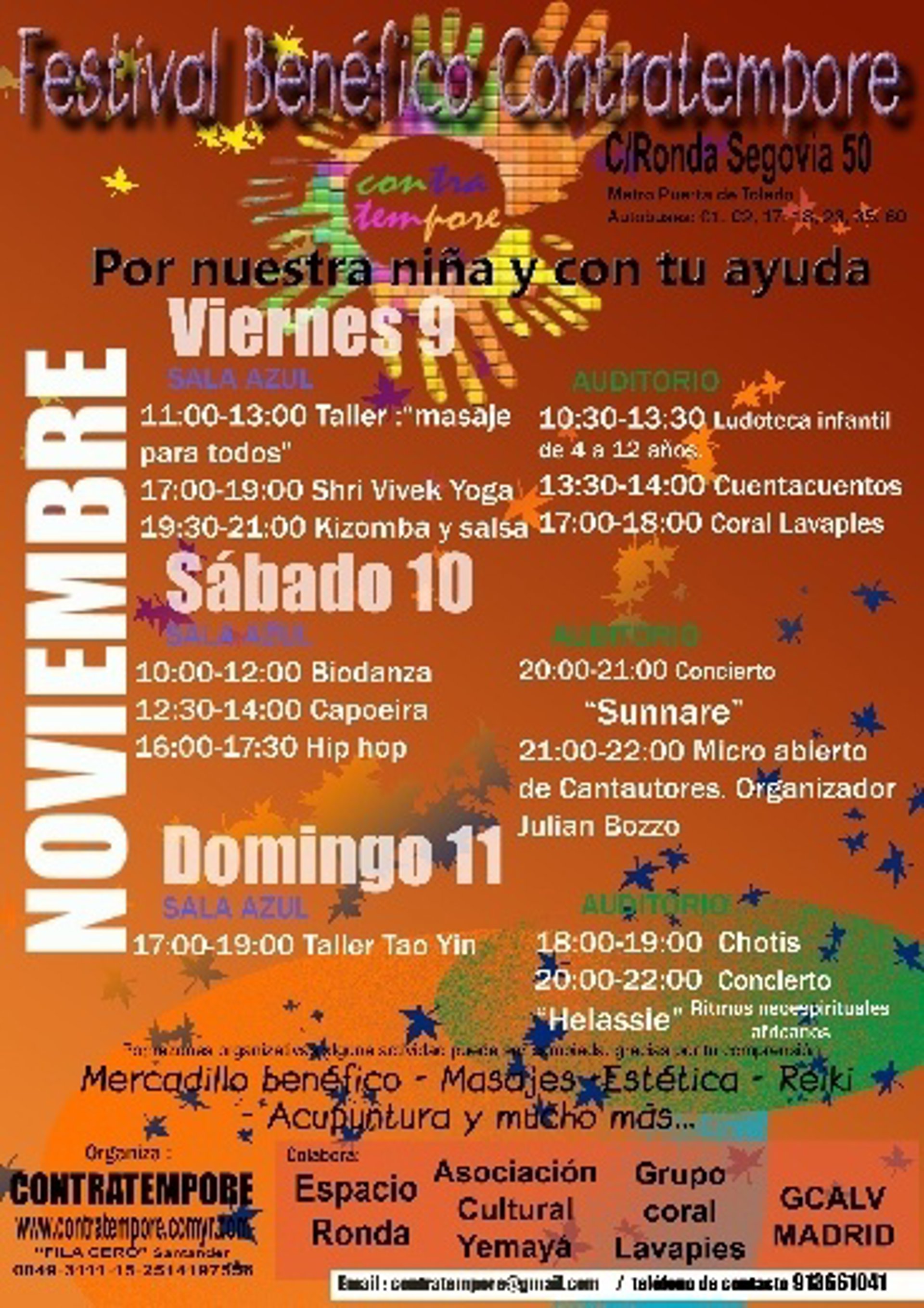 La Asociación Contratempore, ubicada en Móstoles, organiza los días 9, 10 y 11 de noviembre un festival benéfico, que se celebrará en el Espacio Ronda de Madrid, para recaudar los fondos que sufraguen un trasplante urgente de médula para una niña de 12 años, necesario para curar una enfermedad hereditaria llamada Drepanocitosis