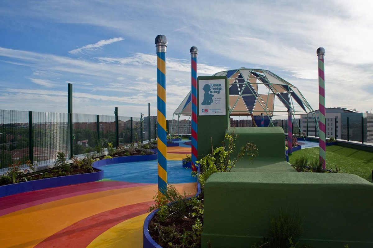 Un "creativo" jardín ubicado en la azotea del hospital Materno Infantil del 12 de Octubre permitirá a niños enfermos de cáncer disfrutar de esta instalación realizada por la Fundación Juegaterapia bajo el lema "para que la Quimio jugando se pase volando".