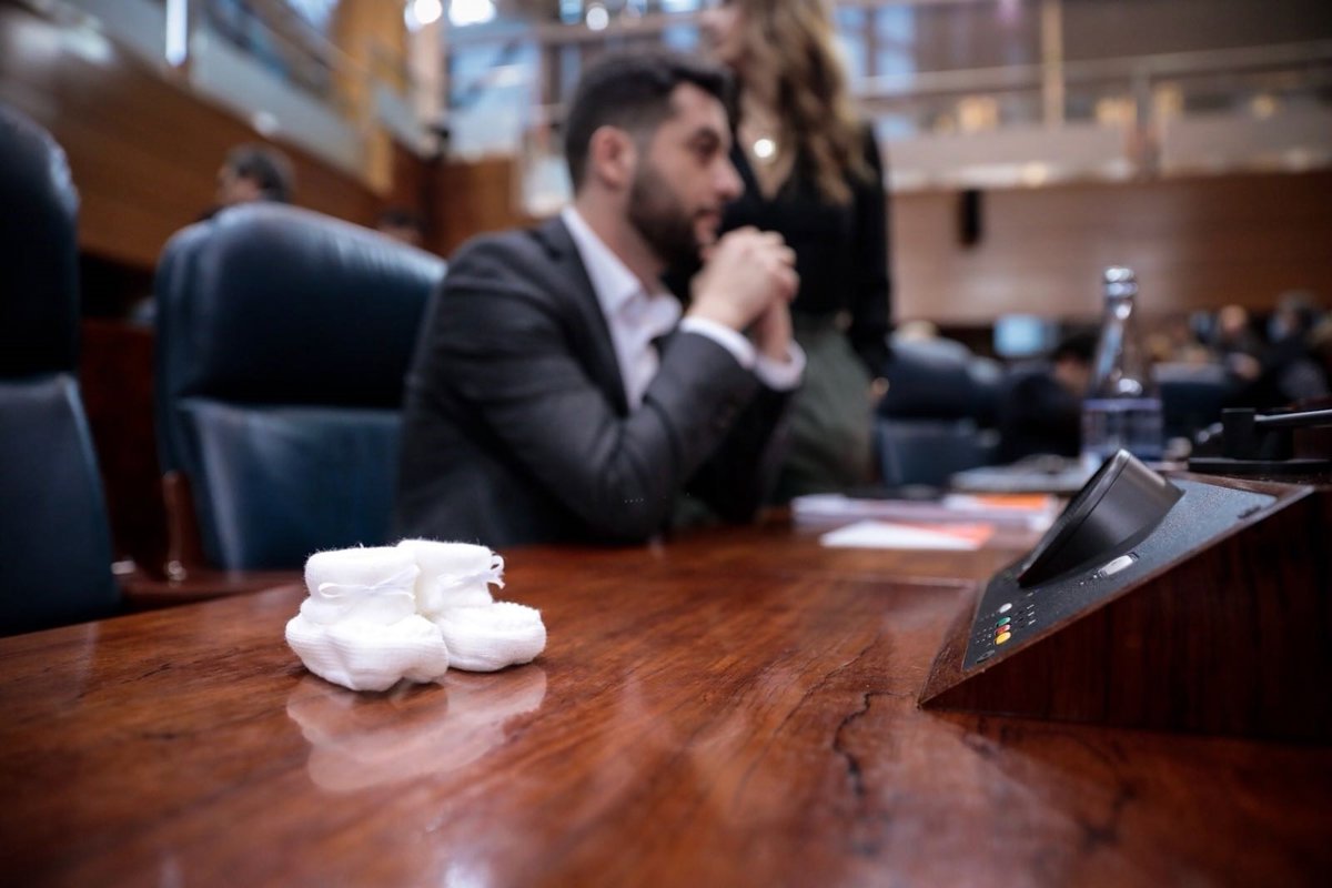 El Grupo Parlamentario de Ciudadanos ha querido este jueves, durante el Pleno de la Asamblea, hacer un guiño a su portavoz, Ignacio Aguado, colocando en su escaño unos patucos, que posteriormente le regalarán, después de que haya sido recientemente padre y esté disfrutando de su permiso de paternidad.