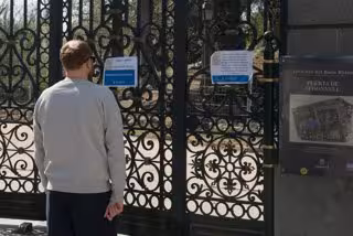 Un transeúnte se detiene para leer un cartel colgado en una de las entradas del Retiro, cerrado tras la entrada en vigor del estado de alarma - Joaquin Corchero / AFP7 / Europa Press