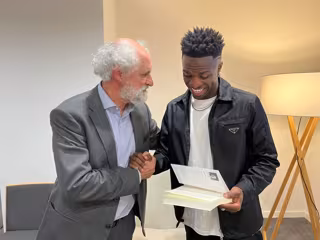 En un encuentro con Vinicius le hicieron entrega de un ejemplar dedicado de 'El factor humano (Invictus)', un libro sobre cómo Nelson Mandela aprovechó el deporte para unir a una sociedad contra el racismo y el apartheid.