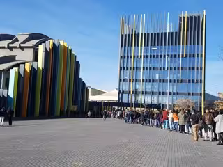 La cola está formada desde una hora antes de que comience el acto en unas instalaciones que colgarán el cartel de completo para el aforo de 2.000 personas, según la organización. A medida que vayan entrando serán recibidos con un desayuno en el que no podrían faltar las ya famosas madalenas de Carmena.