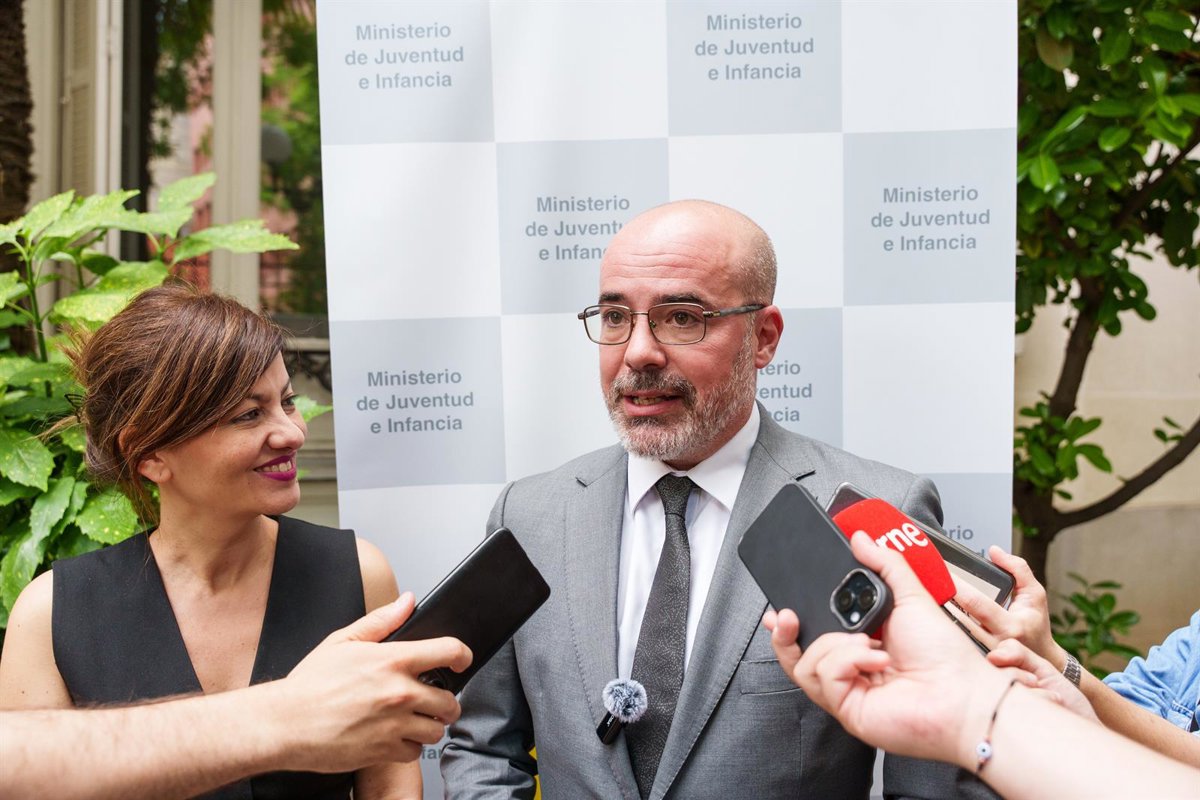 El delegado del Gobierno en la Comunidad de Madrid, Francisco Martín, junto a la ministra de Juventud e Infancia, Sira Rego, en la sede ministerial. - Matias Chiofalo - Europa Press