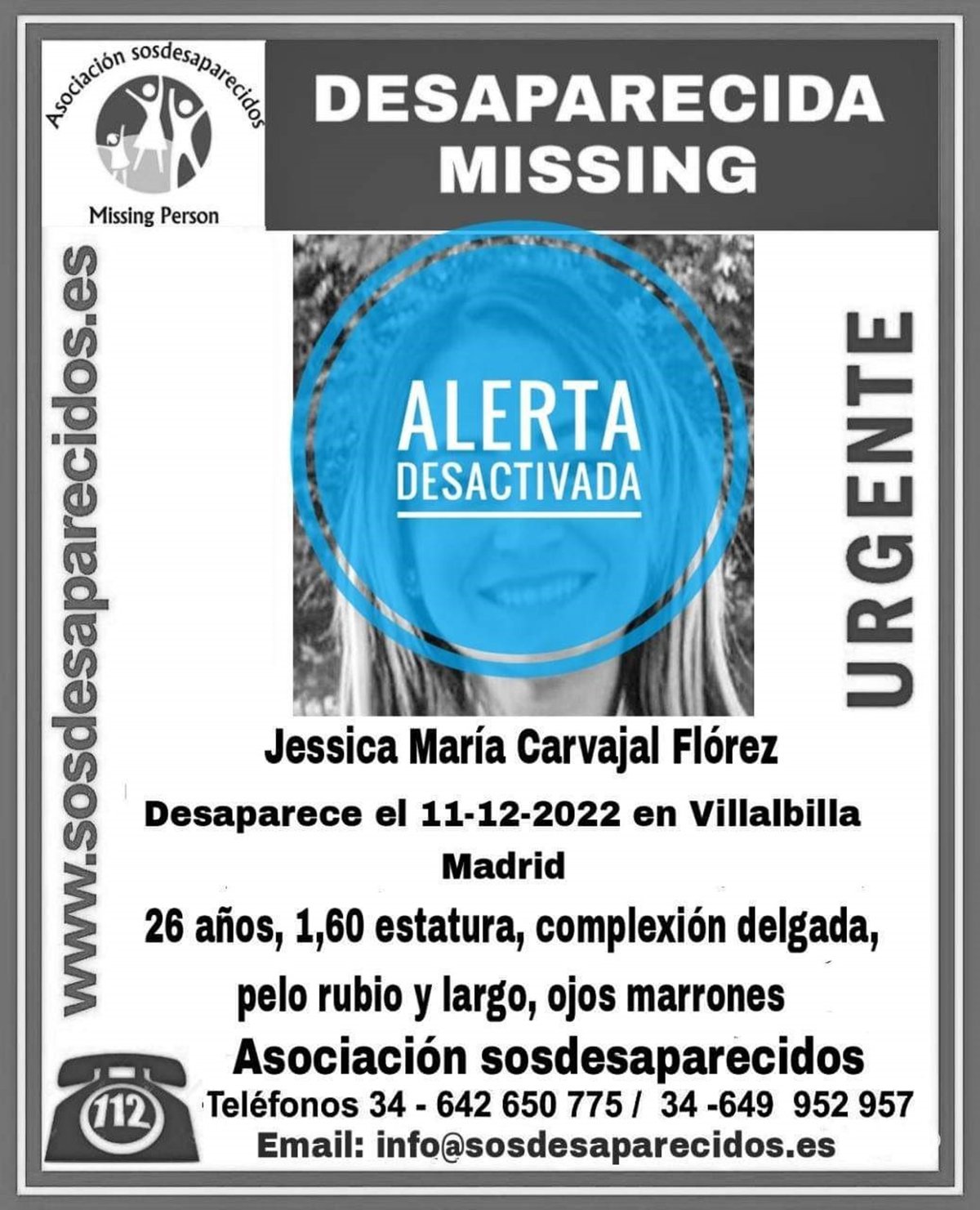 La búsqueda de Jessica M.C.F., la joven de 26 años desaparecida desde el 11 de diciembre en la localidad madrileña de Villalbilla, ha sido desactivada después de contactar con la familia el día de Año Nuevo.