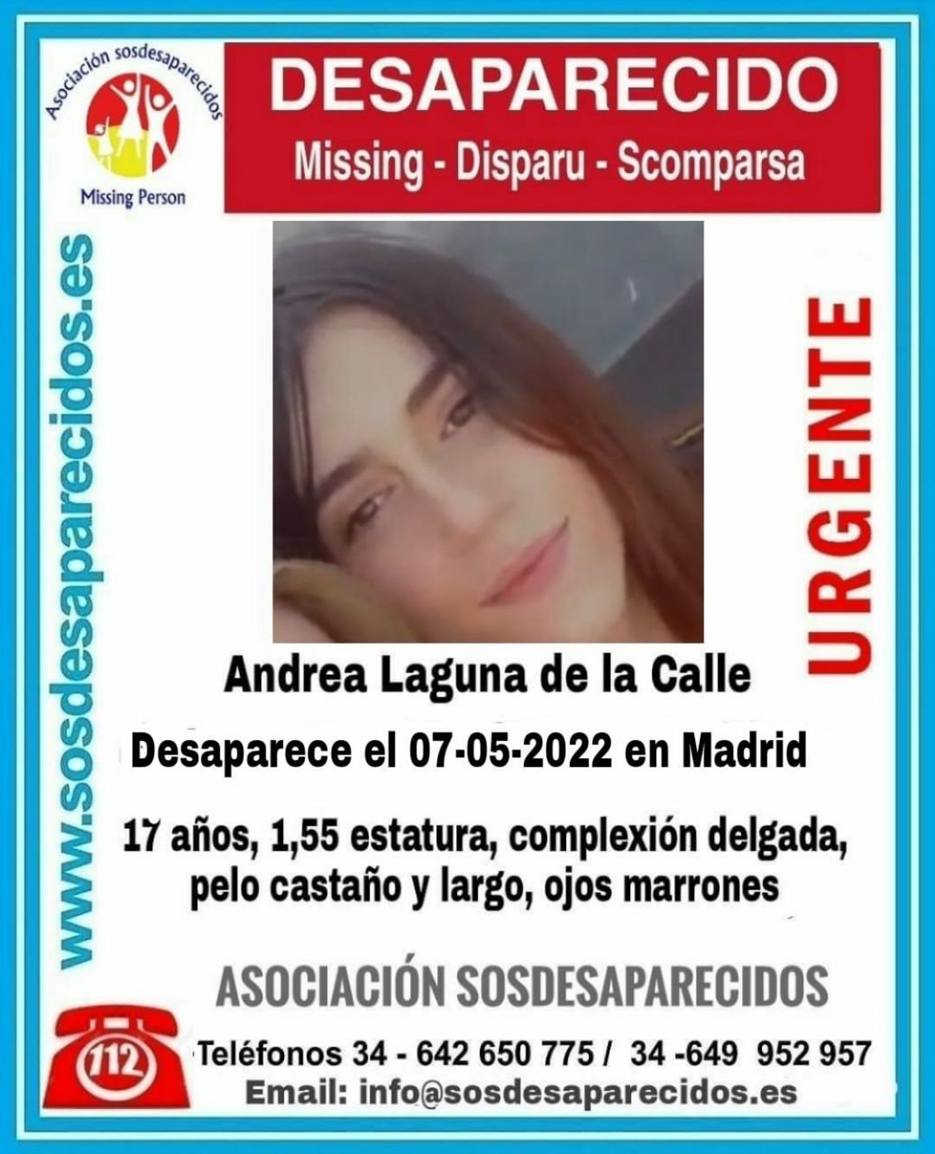 Andrea mide 1,55 metros de estatura, tiene complexión delgada, pelo castaño y largo y ojos marrones, según la alerta lanzada ayer por la asociación SOS Desaparecidos.