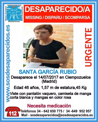 La mujer se llama Santa García Rubio y la última vez que se la vio vestía pantalón vaquero, camisa de manga corta blanca y mangas de color rosa.