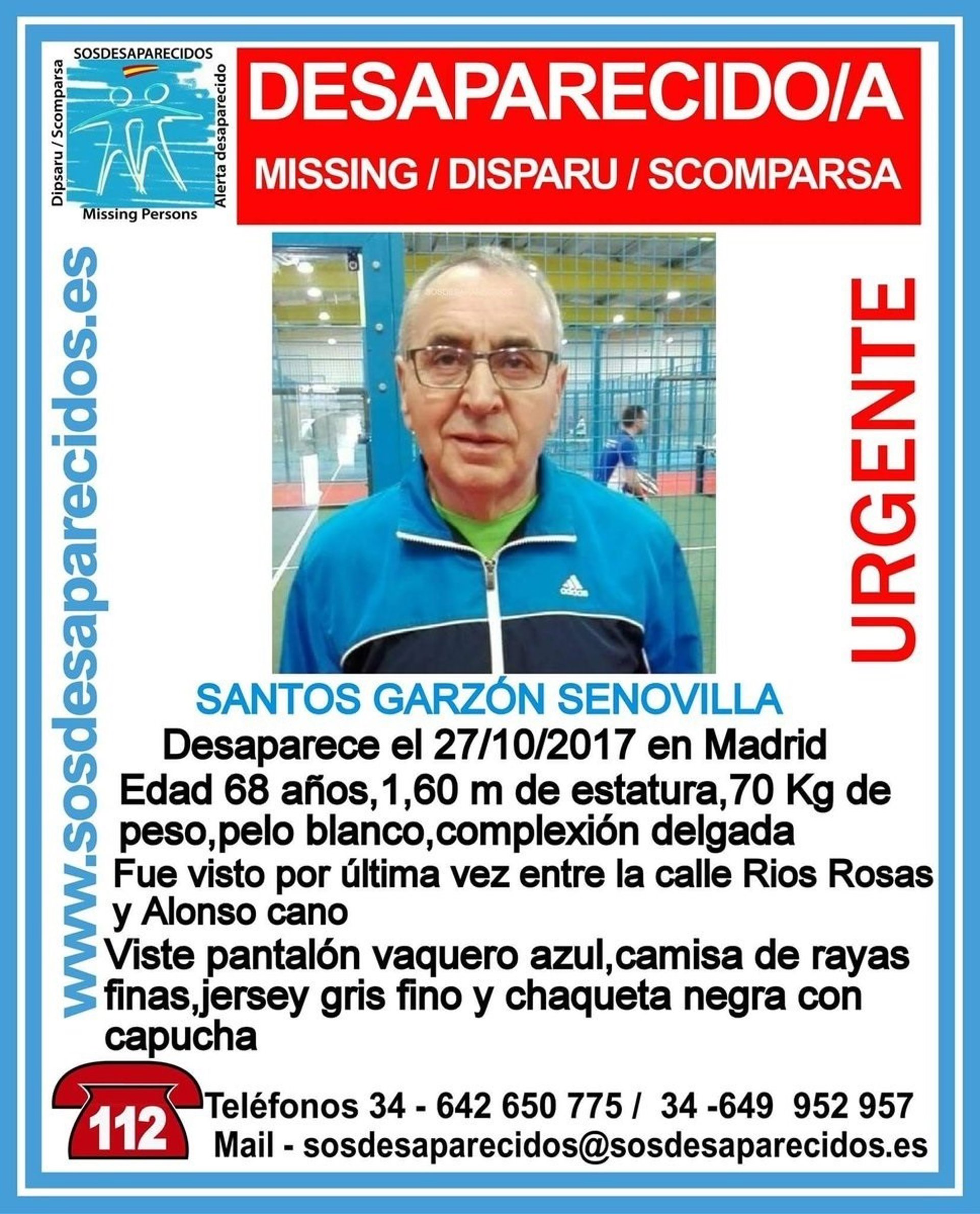 El hombre, Santos Garzón Senovilla, mide 1,60 metros de altura, pesa 70 kilos, es de complexión delgada y tiene el pelo blanco. Iba vestido con un pantalón vaquero azul, una camisa de rayas finas, un jersey gris y una chaqueta negra con capucha.