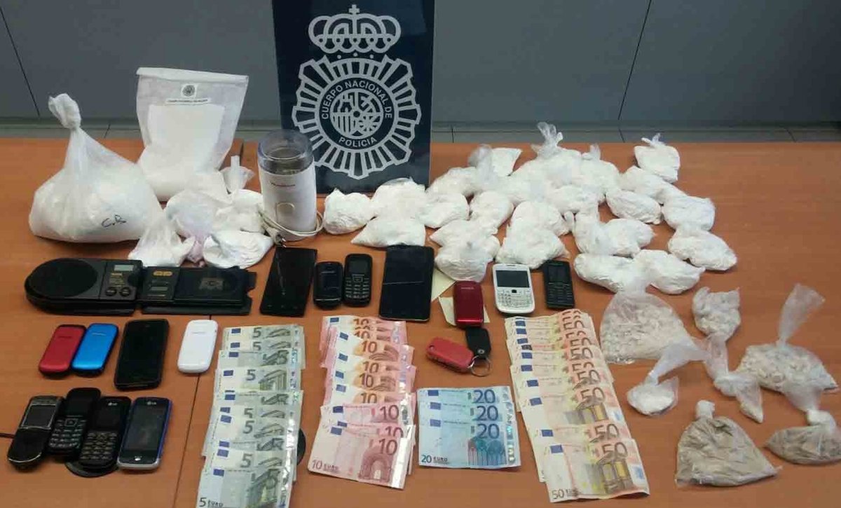 En los registros efectuados en un domicilio y una tienda de alimentación, se requisaron cinco bolsas que contenían 3,500 gramos de sustancia de corte, 300 gramos de cocaína, 62 gramos de heroína, 780 euros en efectivo, dos básculas de precisión,15 móviles, rollos de papel transparente y un molinillo eléctrico.