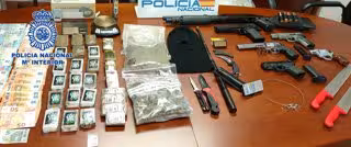 Durante el registro se procedió a la intervención de tres kilogramos de hachís, 500 gramos de marihuana, así como diferentes tipos de armas, las cuales se encontraban perfectamente ordenadas en el armario de la habitación: diversas pistolas y revólveres, un cable estrangulador, navajas variadas, machetes, una defensa extensible, un táser que simulaba tratarse de un teléfono móvil y 1.800 euros en efectivo.