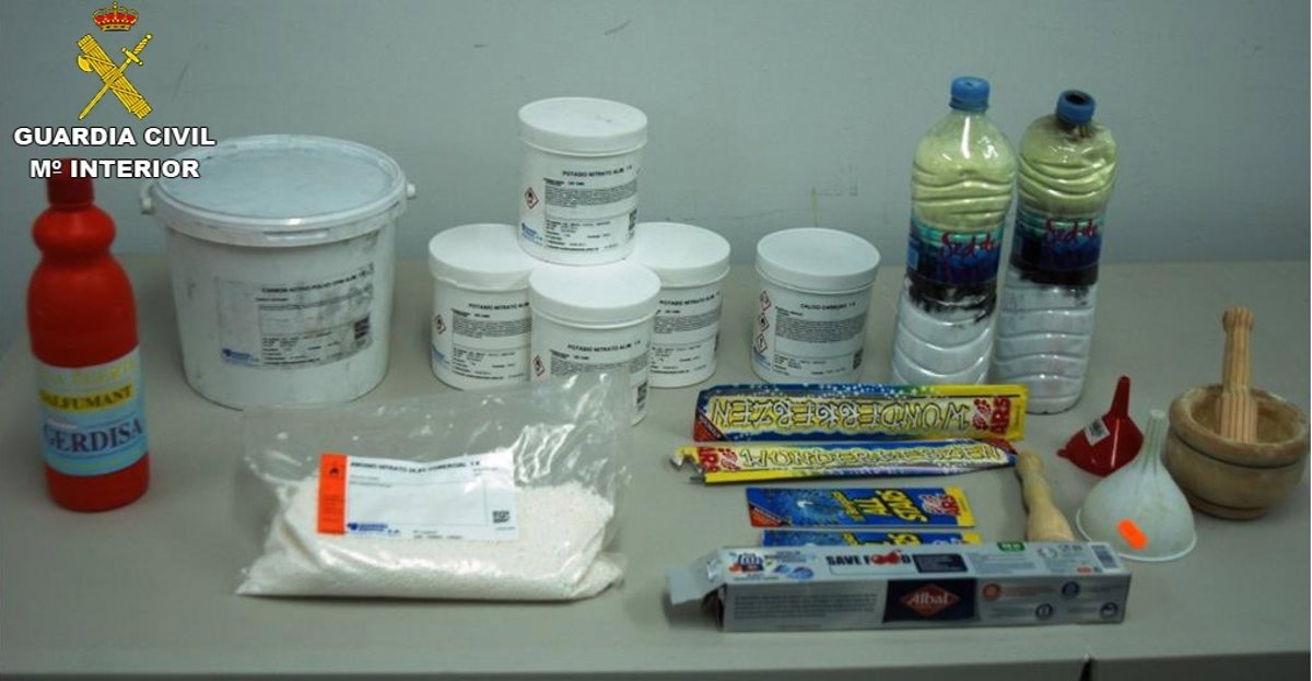 Se realizó un registro en la habitación del hostal que ocupaba el ahora detenido, donde se localizó siete kilos de sustancias precursoras empleadas en la fabricación ilícita de explosivos, instrucciones para la fabricación de estos, así como útiles para la preparación de los mismos.