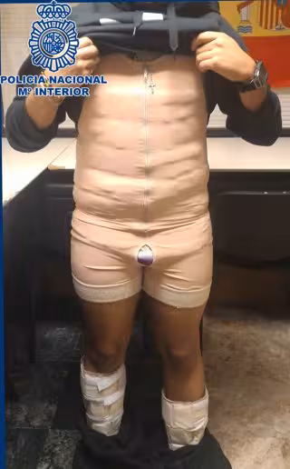 Procedieron a realizarle un cacheo con el que localizaron bajo su ropa, adosados a su cuerpo, en la cintura y sujetos con espinilleras, un total de 122 paquetes que contenían cocaína.