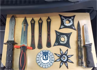 Los agentes localizan una bolsa deportiva negra en cuyo interior se encuentran las armas, entre las que destaca un machete militar, un cuchillo, estrellas shuriken, puntas para lanar, un gancho para escalar y otro machete, además de una navaja tipo mariposa.