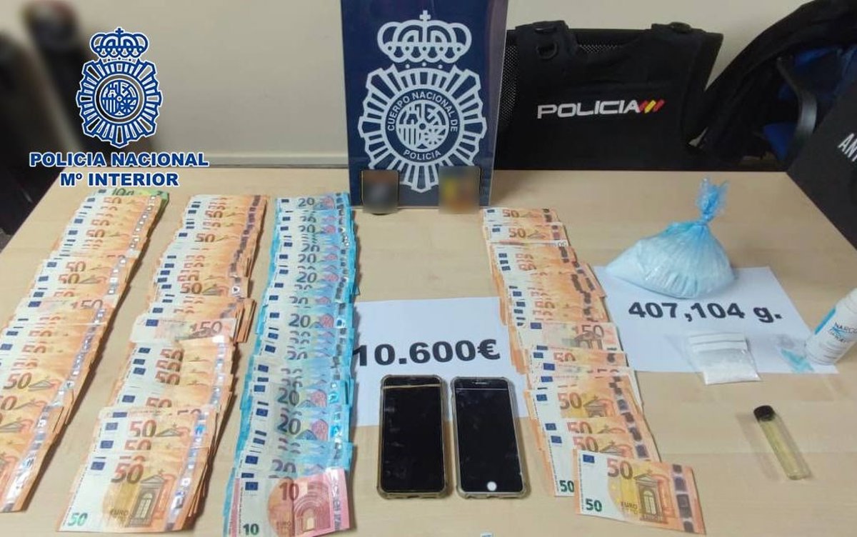 Al realizar el registro de las pertenencias que portaba, localizaron una bolsa con más de 400 gramos de cocaína, otra sustancia líquida también estupefaciente, así como 10.600 euros en efectivo.