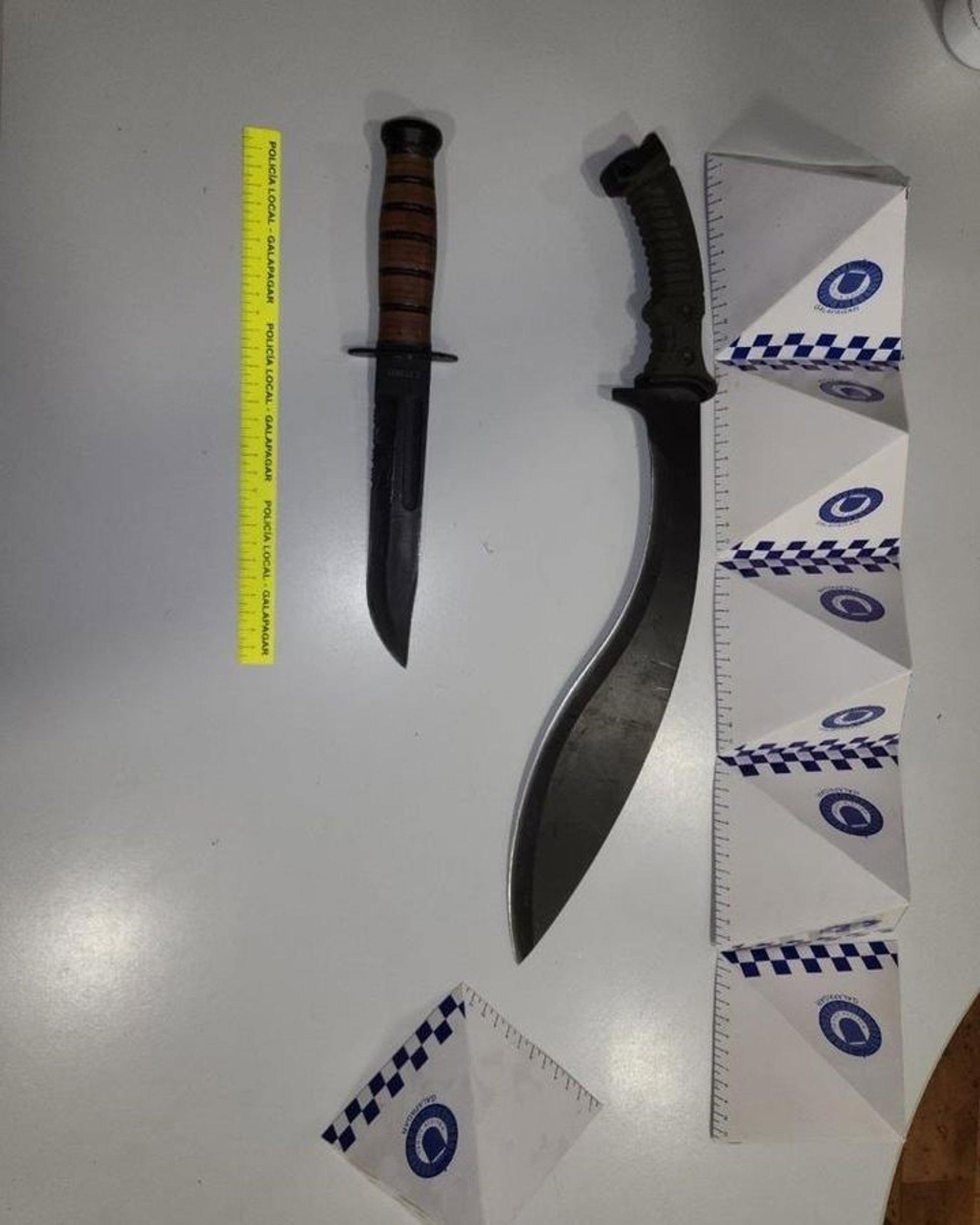 insultando tanto a vecinos como a los policías, volviendo al mismo para "armarse" con dos cuchillos militares. Se trata de un kukri usado por los soldados nepalíes llamados 'kurkas' y del cuchillo 'los mariners estadounidenses', también conocido como 'kabar'.