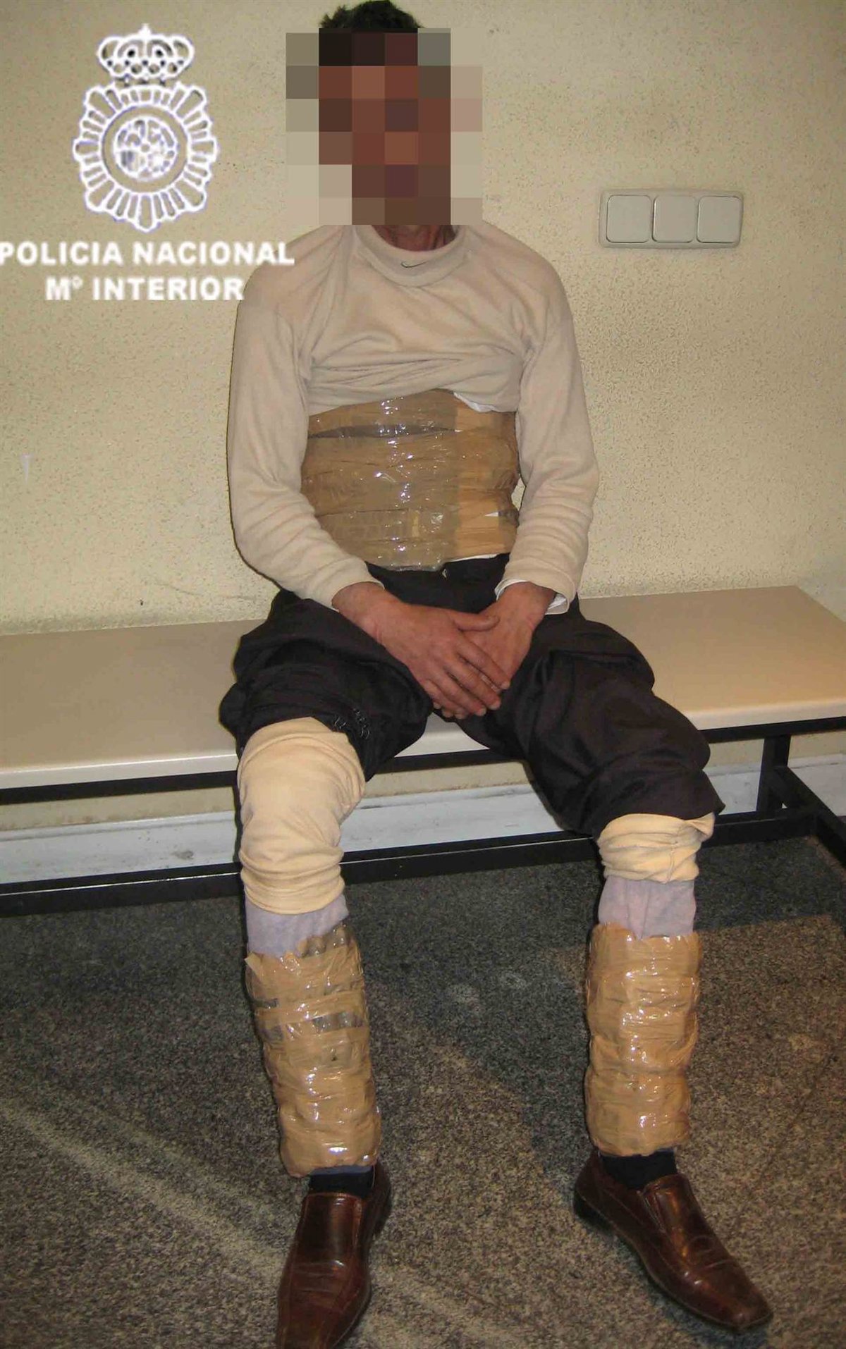 Allí se le pudo localizar 325 "bellotas" y 30 bolsas de polen de hachís, todas ellas envueltas en papel celofan y adheridas con cinta aislante a su abdomen y piernas. El peso total de la sustancia intervenida asciende a 5.513 gramos.