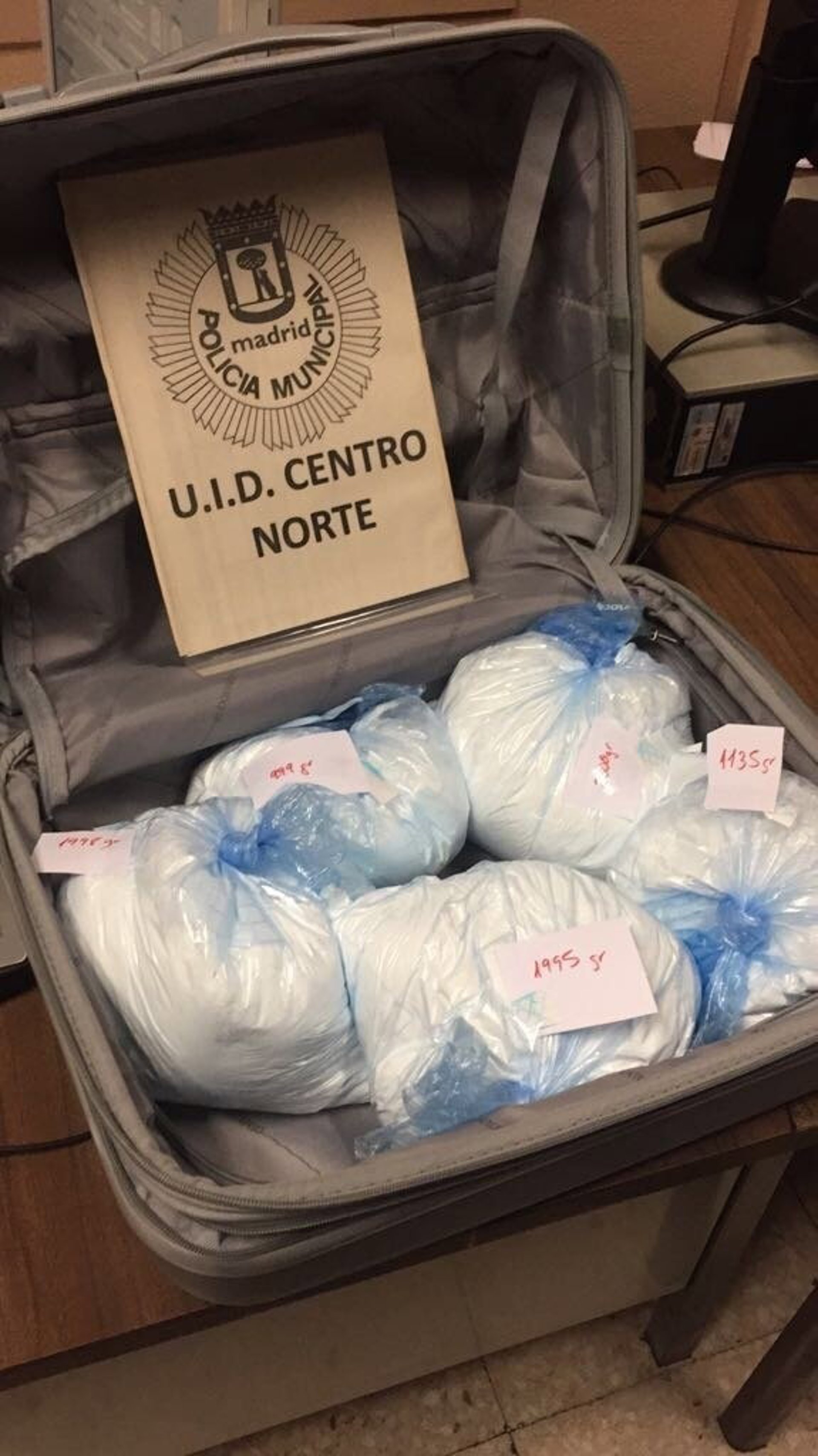 La Policía Municipal de Madrid ha detenido a dos personas que transportaban ocho kilos de cocaína, envueltos en cinco bolsas transparentes dentro de una maleta, en un vehículo en un control rutinario en la calle Gran Vía.