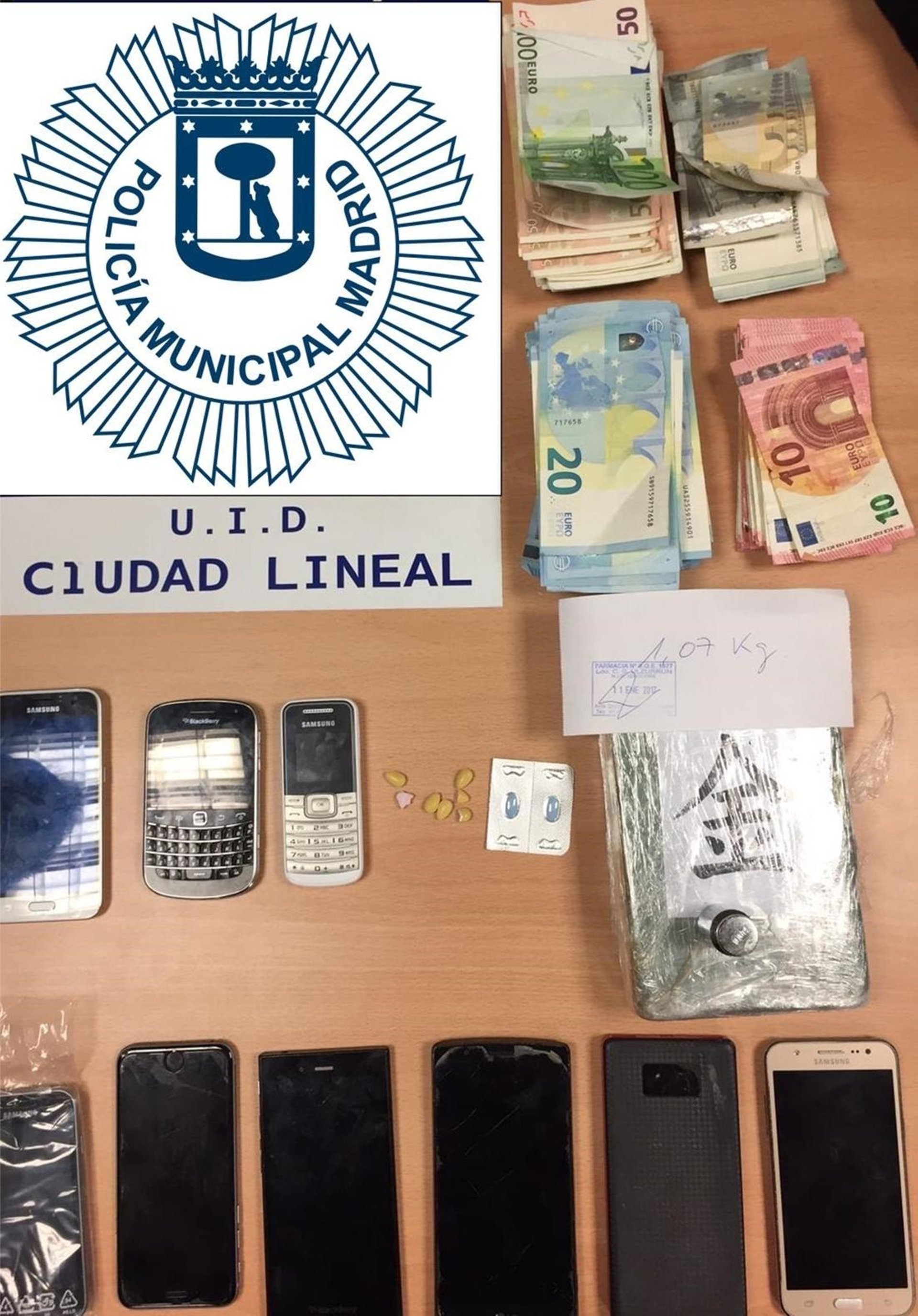 Además del paquete de un kilogramo de cocaína, del dinero y los móviles, se incautaron en el registro una balanza de pesaje y diversas pastillas.