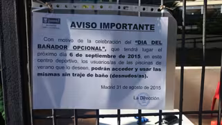 Así, el Centro Deportivo Municipal de Casa de Campo ha puesto carteles a lo largo de toda la instalación con el siguiente aviso: "Con motivo de la celebración del 'Día del Bañador Opcional', que tendrá lugar el próximo 6 de septiembre de 2015, en este centro deportivo, los usuarios/as de las piscinas de verano que lo deseen, podrán acceder y usar las mismas sin traje de baño (desnudos/as)".