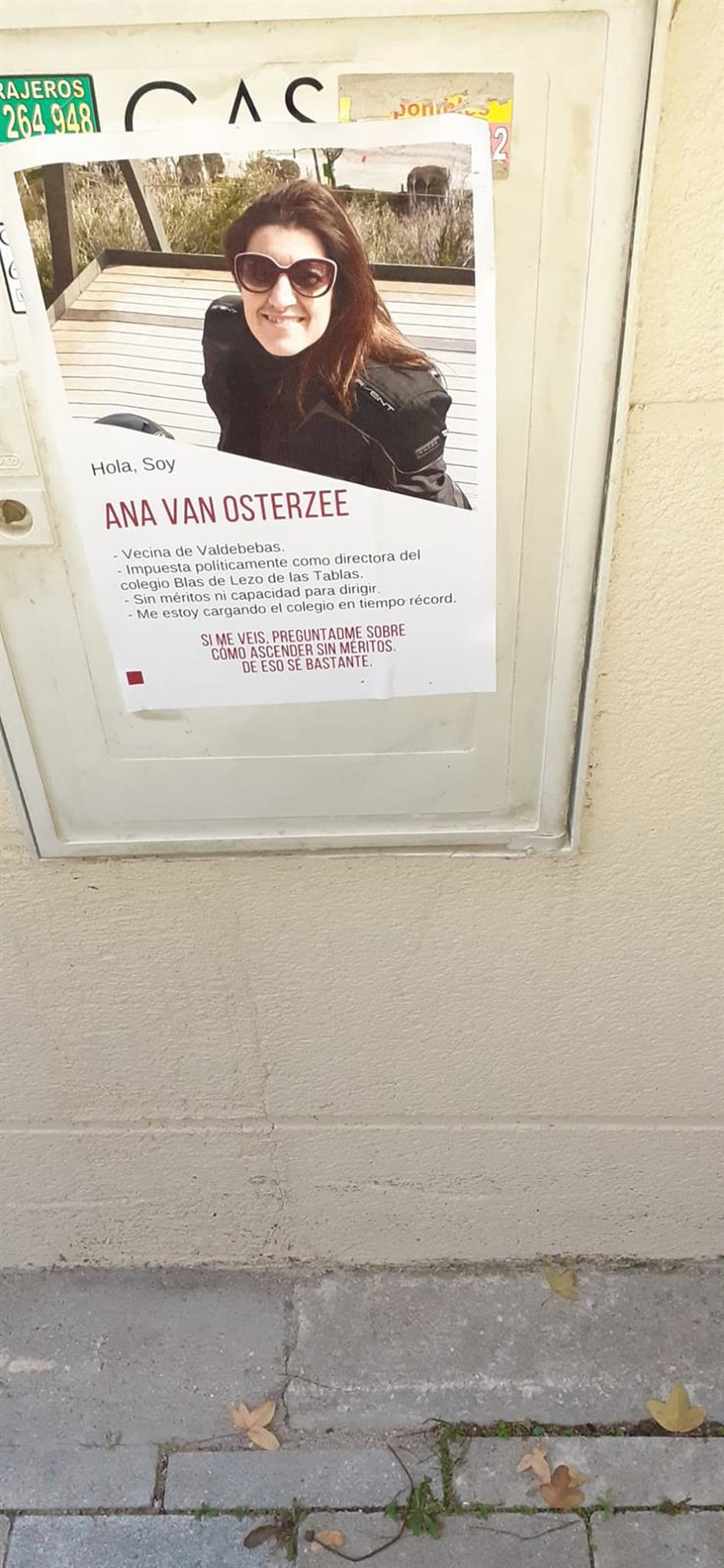 En los carteles con la foto de la directora se ve su foto y la leyenda: "Hola, soy Ana Van Osterzee, vecina de Valdebebas, impuesta políticamente como directora del colegio Blas de Lezo de Las Tablas, sin méritos ni capacidad para dirigir". Y agregan: "Me estoy cargando el colegio en tiempo récord".