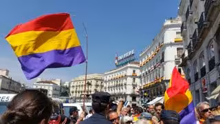 Dos centenares de partidarios de la República se manifiestan en el centro de Madrid muy controlados por agentes de la Policía, que vigila de cerca cada uno de sus pasos y les sigue en su recorrido por la céntrica plaza madrileña.