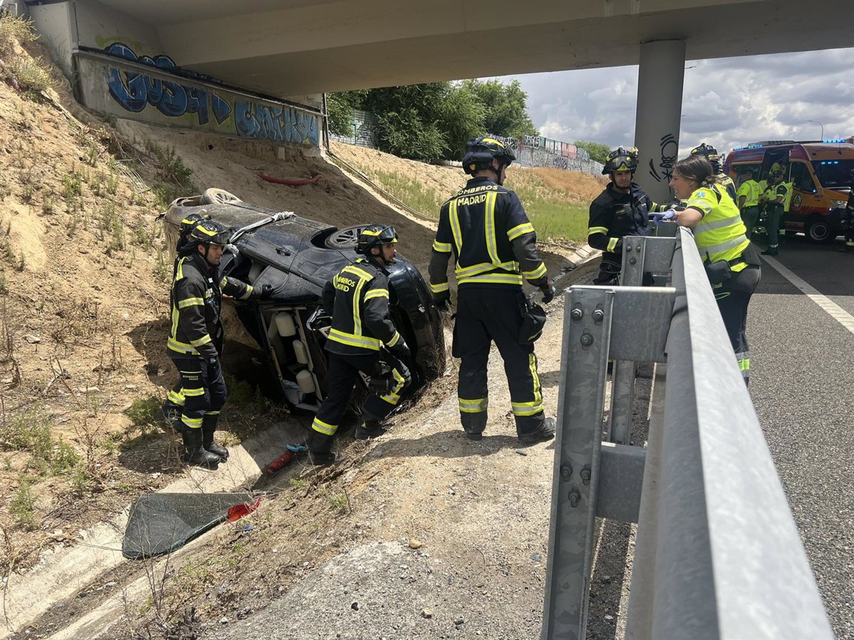 Al lugar han acudido efectivos de los Bomberos de la Comunidad de Madrid, que han trabajado con una grúa para sacar el vehículo del terraplén y asegurar el vehículo hasta retirarlo de la vía.