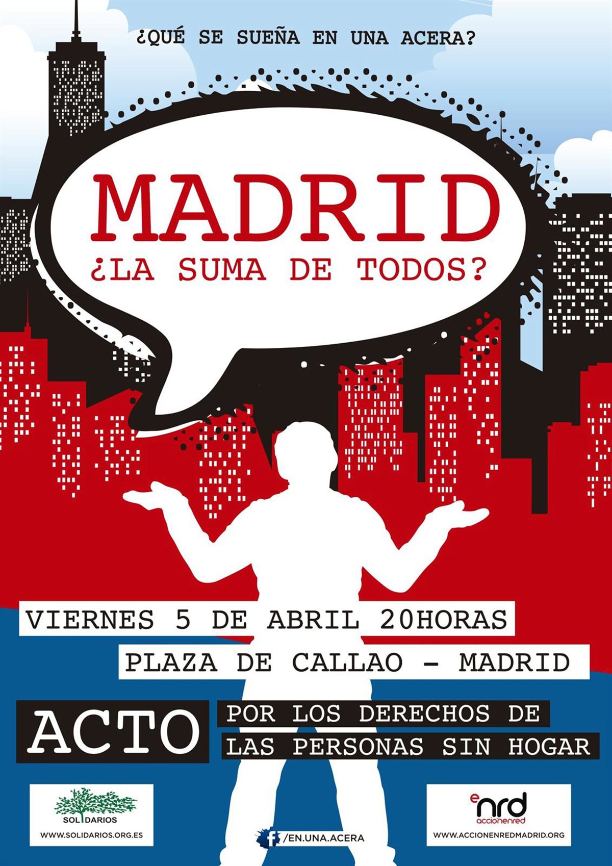 Las ONG Voluntarios de Acción en Red y Solidarios realizarán este viernes, 5 de abril, una obra de teatro en la Plaza de Callao para protestar por la finalización de la Campaña de Frío del Ayuntamiento de Madrid, vigente entre el 25 de noviembre y el 31 de marzo, así como para exigir la mejora de la atención a las personas sin hogar.