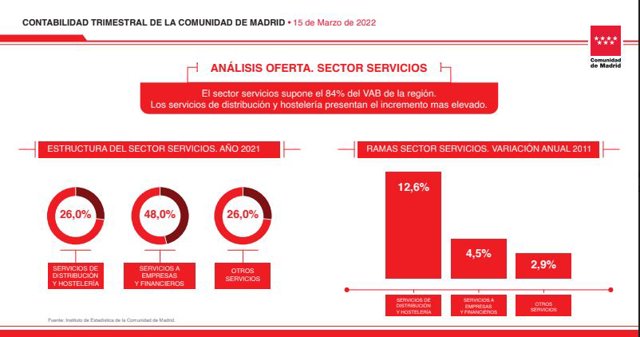 Ya dentro del sector servicios, que supone el 84% del Valor Agregado Bruto (VAB) madrileño, destaca el incremento en la distribución y hostelería, que han experimentado el mayor repunte y se ha situado en el 12,6% después de la contracción que alcanzó el 47,2% en 2020 y de haber estado descendiendo hasta principios de 2021.