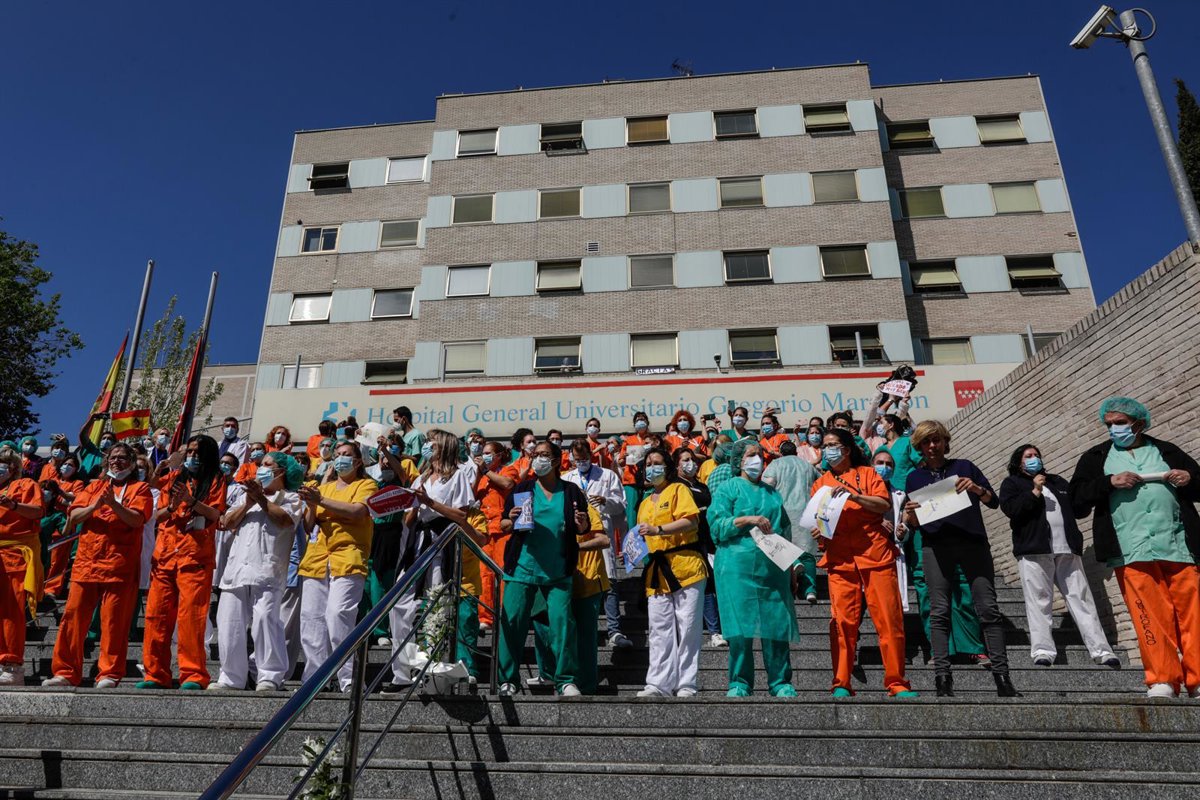 Un grupo de trabajadores del Hospital Gregorio Marañón, en la entrada del centro, en Madrid (España) a 12 de abril de 2020. - Jesús Hellín - Europa Press - Archivo