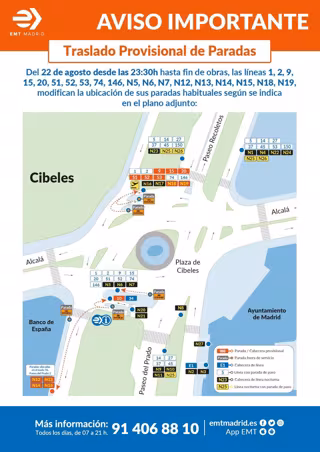 Este traslado afectarán a 25 líneas diurnas y nocturnas de las paradas de la plaza de Cibeles, debido a que los trabajos de asfalto continúan avanzando, siendo este el inicio de la segunda fase de las obras.