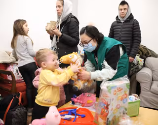 Voluntarias entregan juguetes a niños llegados de Ucrania, tras haber finalizado un viaje en autobús - Marta Fernández Jara - Europa Press