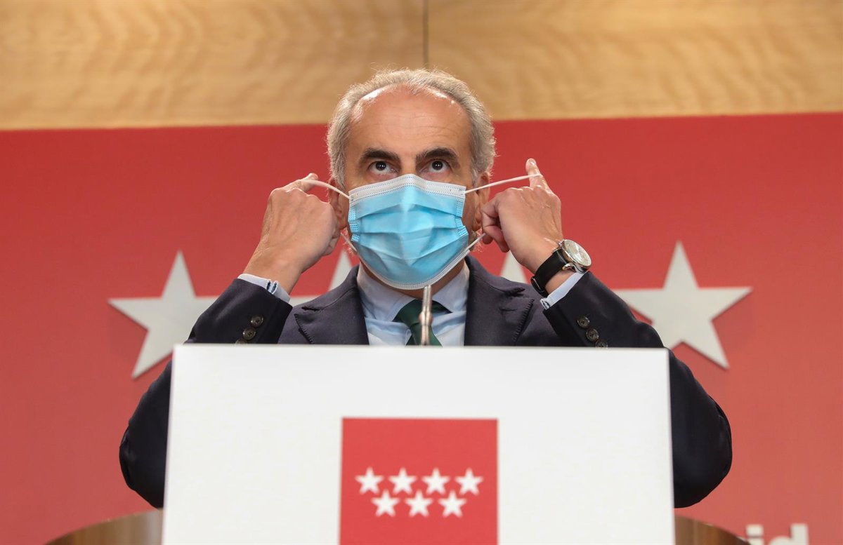 El consejero de Sanidad de la Comunidad de Madrid, Enrique Ruiz Escudero, se quita la mascarilla para intervenir en una rueda de prensa ante los medios para informar de nuevas medidas en la región debido a la crisis sanitaria del Covid-19, en Madrid, (E - EUROPA PRESS/M.FERNÁNDEZ. POOL - Europa Press