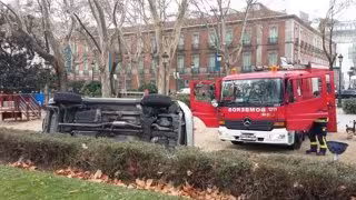 Una mujer de 60 años que conducía su coche por el Paseo del Prado, dirección Cibeles, se ha mareado, ha perdido el control del vehículo, ha arrancado un semáforo y ha acabado volcada en un parque infantil, llevándose por delante a dos personas que esperaban para cruzar por el paso de cebra.