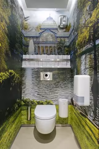 Los lavabos, todos de alta gama, son de la firma Roca, cuentan con "griferías electrónicas", y tienen las paredes recubiertas de "sorprendentes" fotografías, según informa la compañía. Además, están ambientados con música y cuentan con accesos para minusválidos, una tienda de artículos de parafarmacia y salas para familias, así como para lactancia.