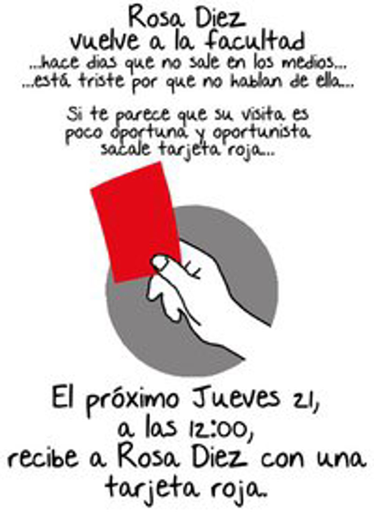 Estudiantes de la Universidad Complutense de Madrid (UCM) han llamado a recibir con tarjetas rojas a la diputada de UPyD en el Congreso, Rosa Díez, que impartirá una conferencia a las 12 horas de este jueves en la Facultad de Ciencias Políticas, en una iniciativa contra el uso de esta universidad como "trampolín mediático", según informan a través de su sitio en Internet.