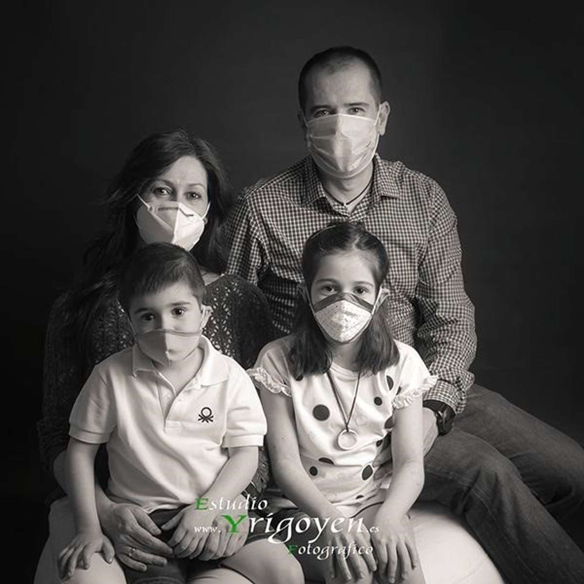 Imagen de una familia de Pinto retratada con mascarillas. - ESTUDIO FOTOGRÁFICO 'YRIGOYEN'