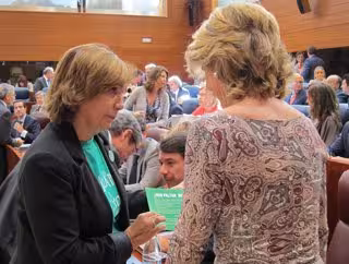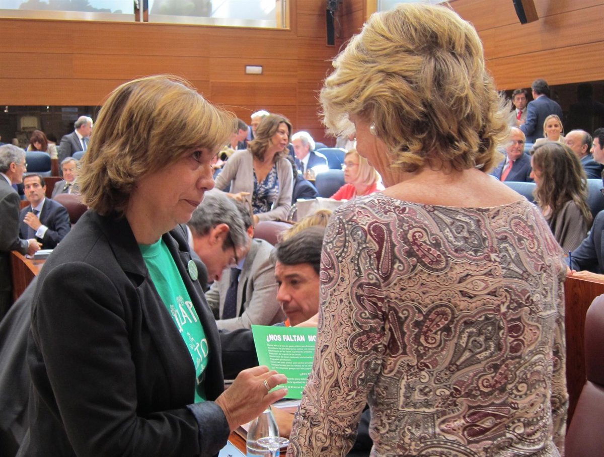 La diputada de Izquierda Unida en la Asamblea de Madrid Eulalia Vaquero ha entregado a la presidenta regional, Esperanza Aguirre, una tarjeta verde sobre la defensa a la escuela pública en nombre de la plataforma de Vallecas y ha compartido con ella unas palabras respecto a la actual situación del conflicto educativo en la región.