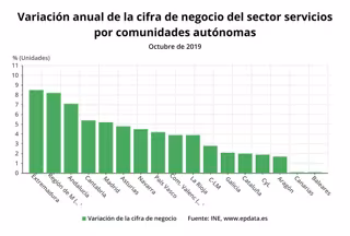 Las ventas del sector servicios subieron en octubre en todas las comunidades autónomas. Los mayores avances correspondieron a Extremadura (+8,5%), Murcia (+8,2%) y Andalucía (+7,1%) y los menores a Baleares y Canarias (+0,1% en ambos casos).
