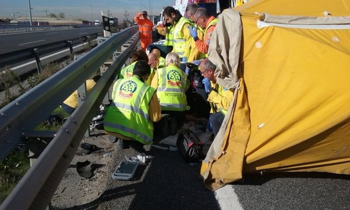 El accidente de tráfico tuvo lugar sobre las 13 horas en el kilómetro 12 de la carretera de Valencia, sentido entrada a la capital, ya cerca de Rivas-Vaciamadrid. Por causas que ahora investiga la Guardia Civil, un moto ha colisionado contra la parte trasera de un turismo.
